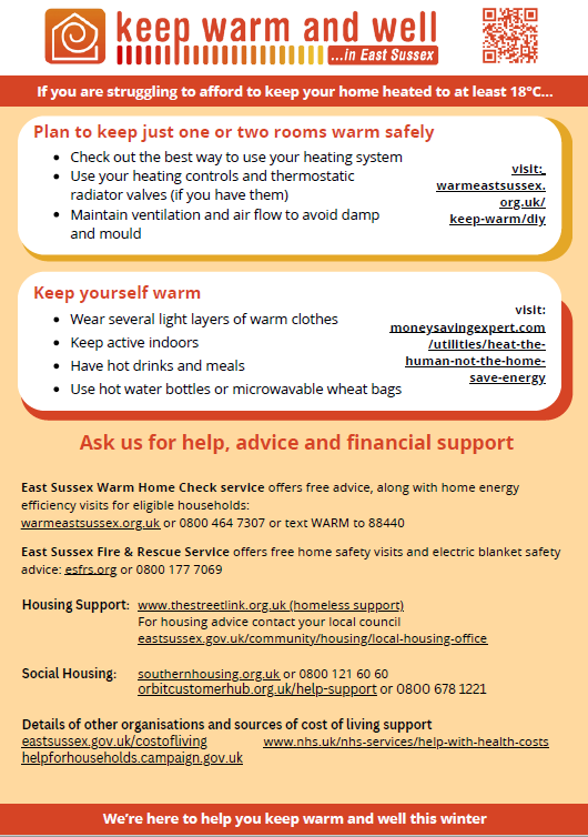 You can request FREE energy advice home visits through www.warmeastsussex.org.uk/warm-home-check or Freephone 0800 464 7307 or Text ARMHOME to 88440